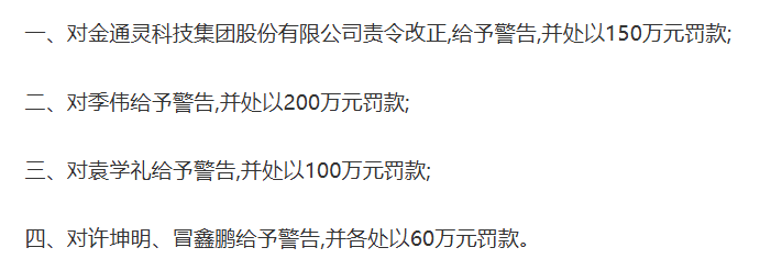江苏证监局决定:对金通灵科技集团股份有限公司责令改正,给予警告,并处以150万元罚款;对季伟给予警告,并处以200万元罚款;对袁学礼给予警告,并处以100万元罚款;对许坤明、冒鑫鹏给予警告,并各处以60万元罚款。