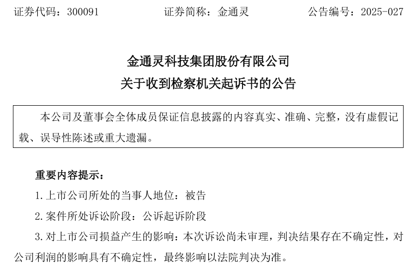 金通灵科技集团股份有限公司(以下简称“金通灵”或“公司”)于近日收到检察机关的《起诉书》,现将有关情况公告如下: