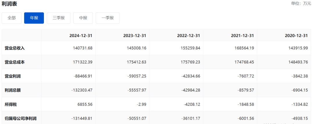 2020年-2024年,金通灵连年亏损,公司归母净利润分别为-0.49亿元、-0.60亿元、-3.61亿元、-5.06亿元、-13.14亿元。